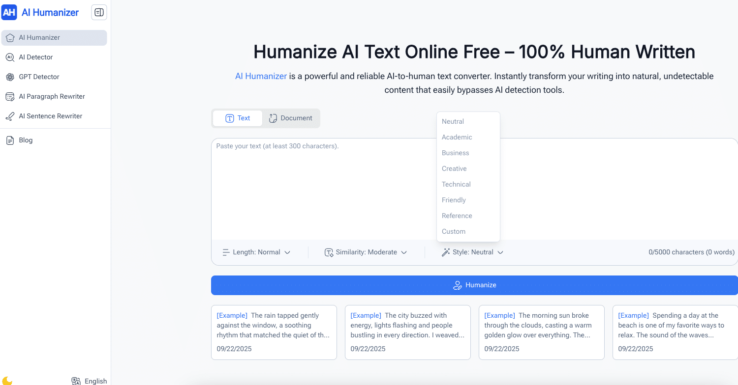 One tool doesn’t fit all writing needs. AI Humanizer lets you pick tones like academic, casual, professional or friendly. Need to make an AI essay sound more scholarly? Choose “academic.” Want a social media draft to feel conversational? Go with “casual.” It adapts to your project, so your writing always fits the moment.