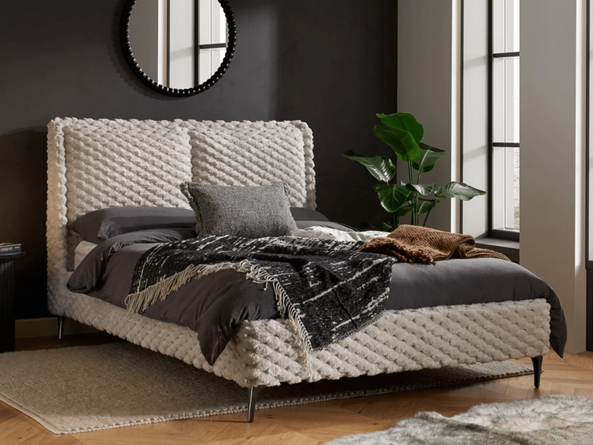 Image source: Bedstar, Taupe bedroom décor with the Tilly upholstered bed frame.