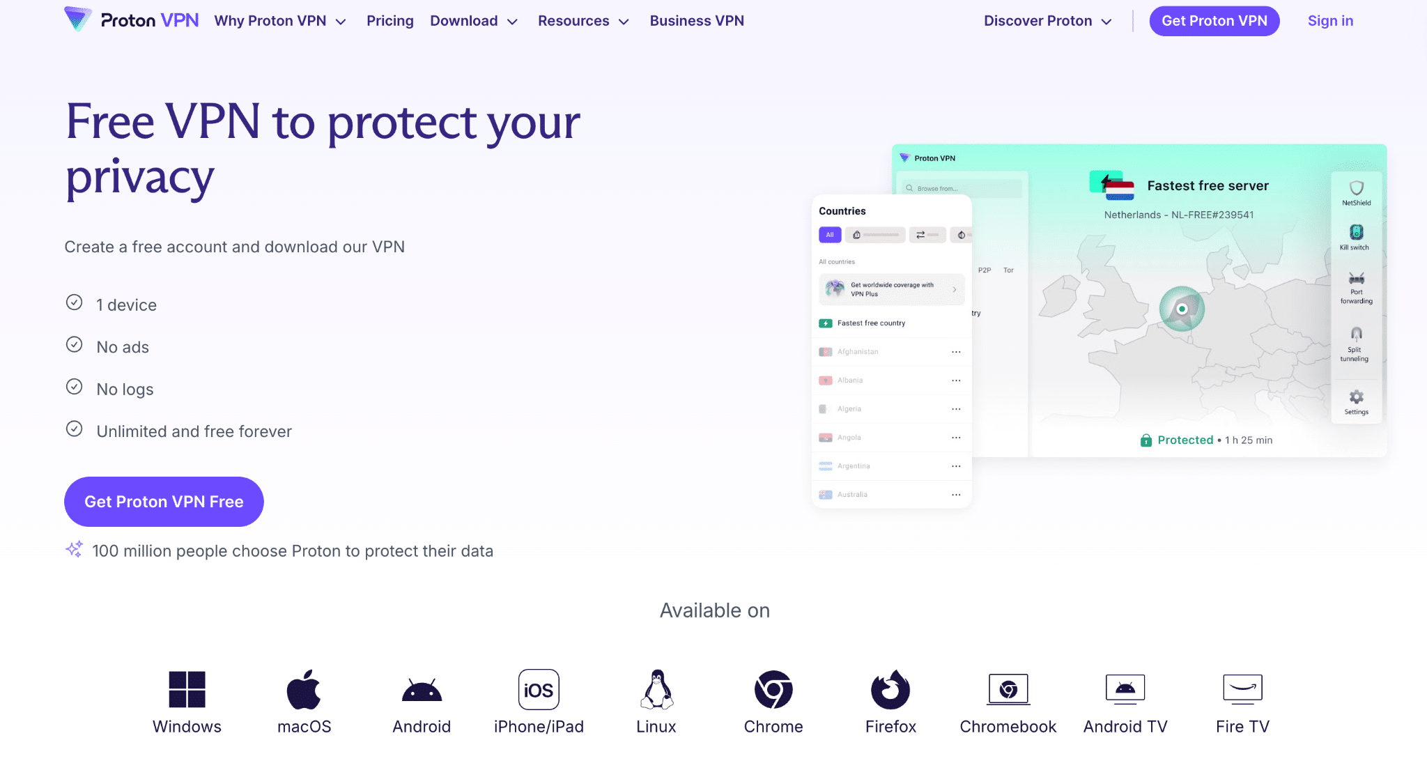 Its open-source apps, Swiss jurisdiction, and repeated third-party audits make it the most trustworthy free VPN available. The main limitation? You can’t manually select specific servers — the app connects you automatically to the fastest available node.