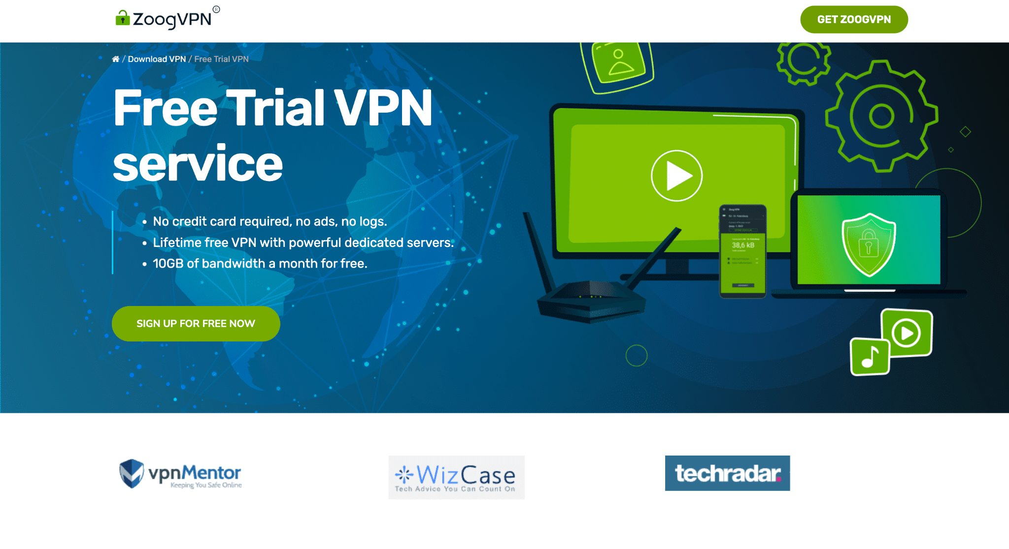 ZoogVPN Free | 10GB/month | 3 | No | No logs | Yes | None | Basic | 1 device |