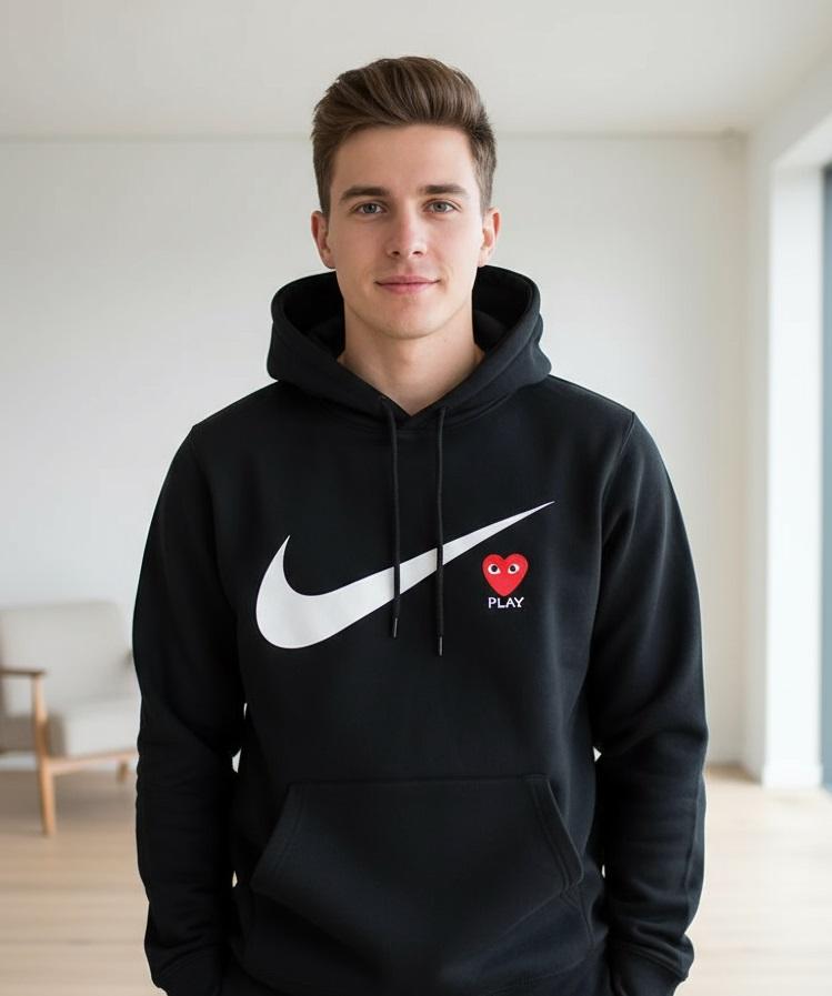 The CDG x Nike hoodie bridges excessive style and overall performance. Designed with precision, it brings structure, texture, and bold co-branding. Fashion it with tech pants, nylon outerwear, or futuristic shoes for a sharp, athletic aesthetic. It’s functional but fashion-forward, embodying what modern CDG streetwear looks like in motion.