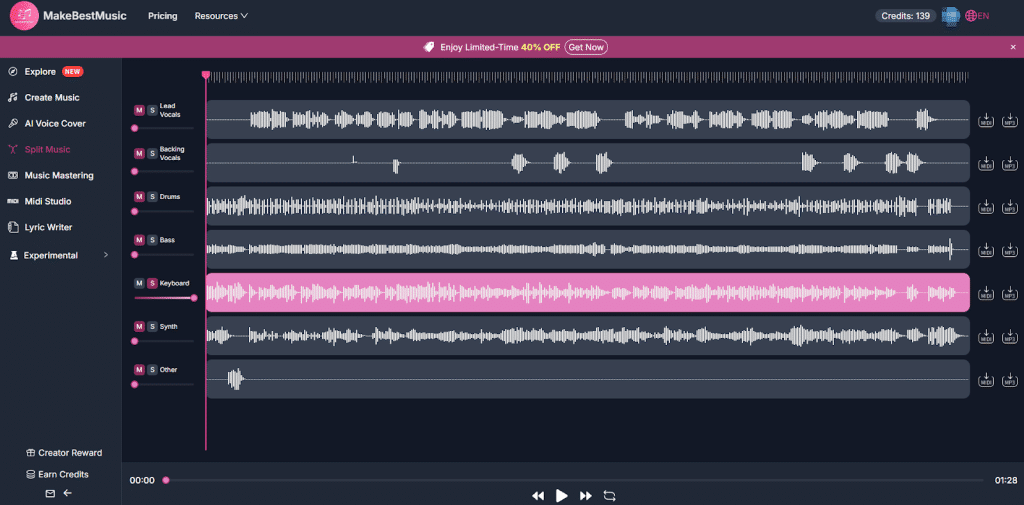 Remixing & Secondary Creation: Paired with MakeBestMusic’s Split Music multi-track isolation feature, creators can not only swap lead vocals but also independently adjust the volume and effects of backing vocals, drums, bass, and other individual tracks. You can even export MIDI or MP3 files for further secondary production.