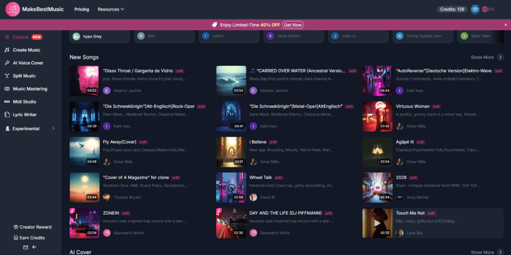 As an all-in-one AI music creation platform, MakeBestMusic offers a complete workflow from beginner to advanced levels—from text-to-song generation and multi-style tag blending, to For You pattern imitation and inspiration discovery in the Explore community. It makes creation both highly efficient and fully controllable.
