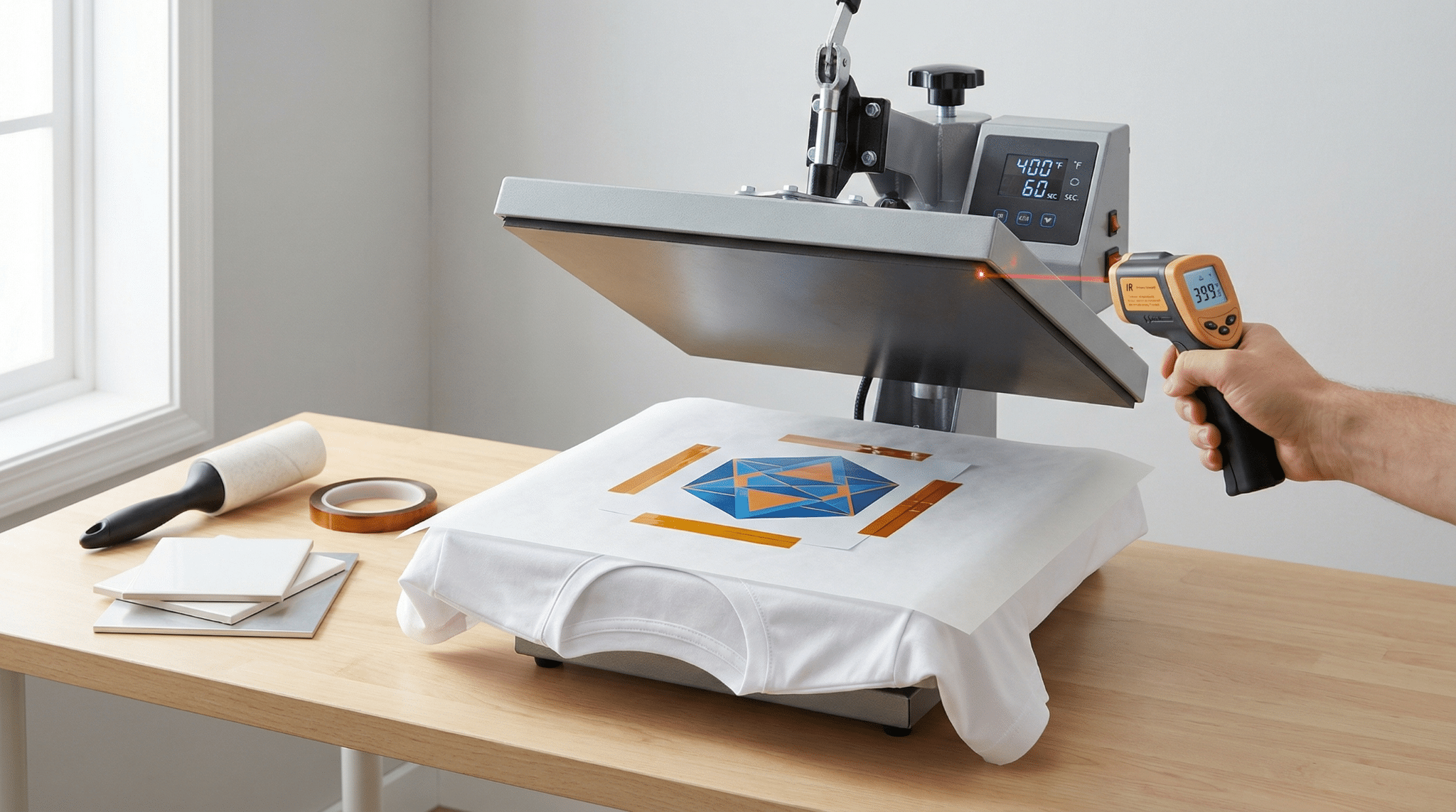 - Infrared thermometer. A $19 temp gun checks platen corners in seconds; each spot should sit within ±5 °F of the set point.