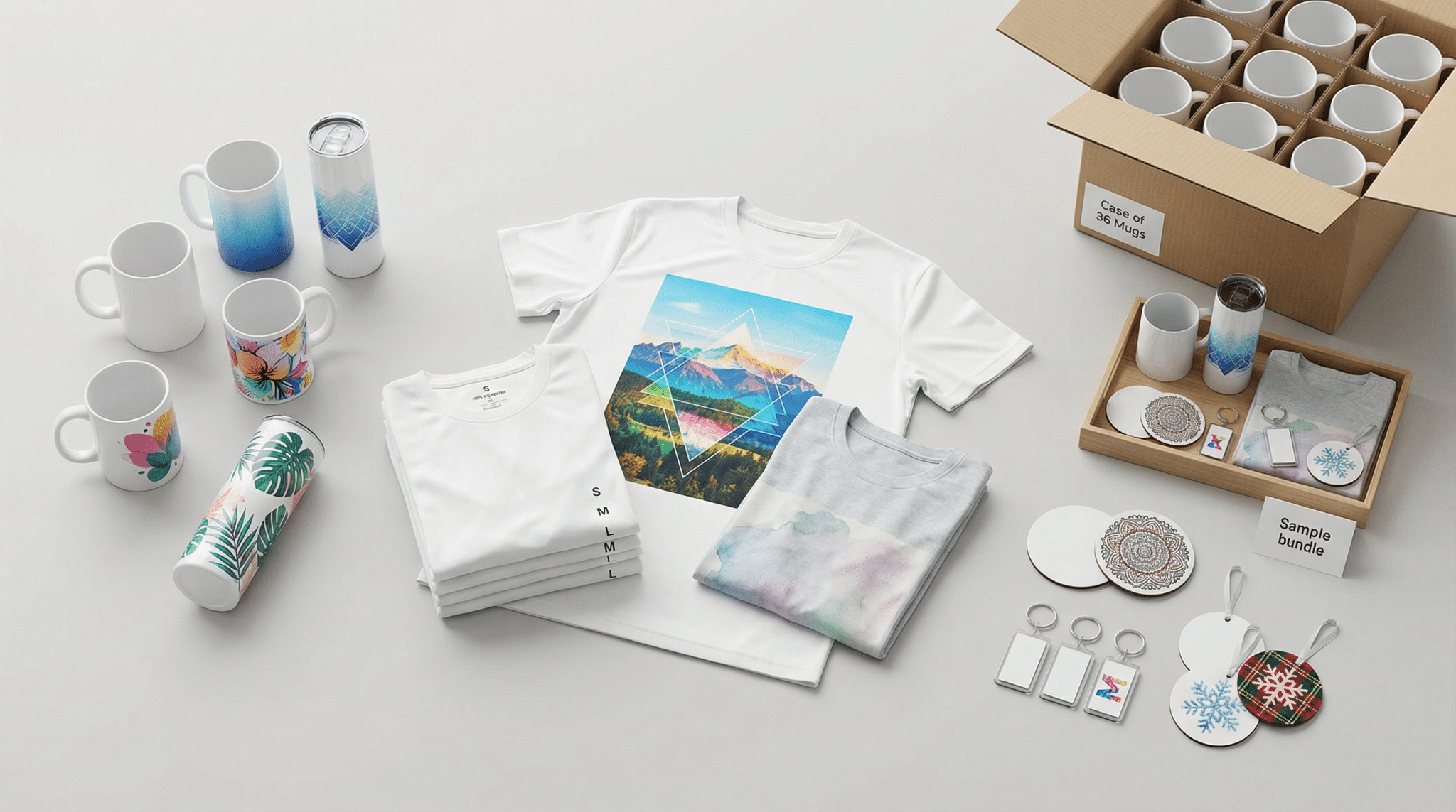 Dye sublimation bonds to polyester (≥65 percent) or a polyester coating; cotton and raw ceramic cannot bond. Proven top sellers include: