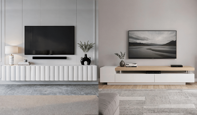 Choose floating units for modern, space-conscious living rooms where you want minimal visual weight. Choose floor-standing units when you need maximum storage, easier installation, or you’re renting without modification permission.