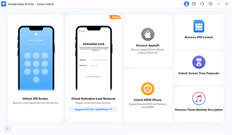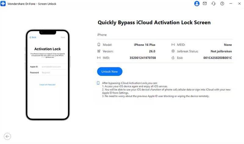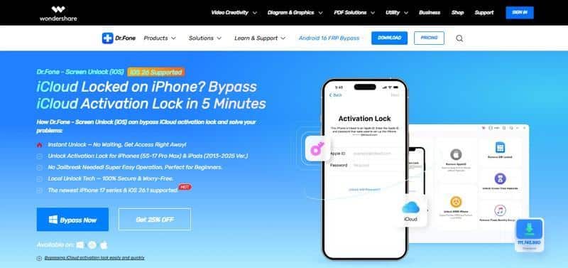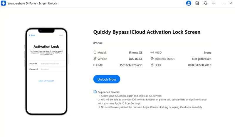 If you want to remove iCloud Activation Lock without performing complex steps, use Dr.Fone – Screen Unlock (iOS). The tool can bypass Activation Lock on iPhones (5s to 17 Pro Max) and iPads (2013-2025 models) as well as iPhone 17 series & iOS 26.1. Along with the major device support, it offers fully guided steps and needs no jailbreak (for certain models).