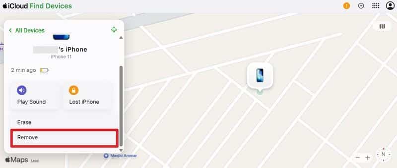 Step 1. Choose Find My on iCloud.com, then tap the “Remove” button for the device you want to bypass.