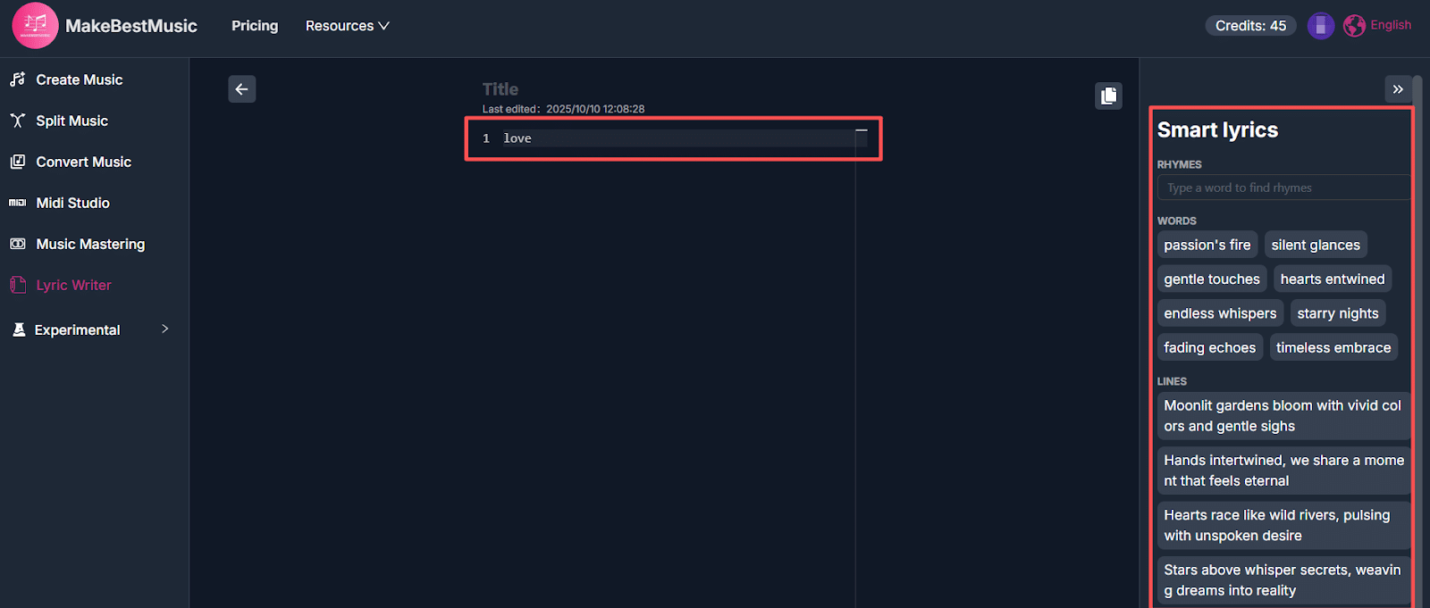 These help the system create a more complete and well-structured song automatically. At this stage, the key is to communicate the emotions, imagery, or key ideas in your mind to makebestmusic. The more specific and vivid your input, the closer the result will be to your vision. And what if you don’t have any lyrics or ideas yet, but still want to create a song? No worries — MakeBestMusic’s lyrics writer can also help you quickly generate high-quality lyrics based on your theme or mood.