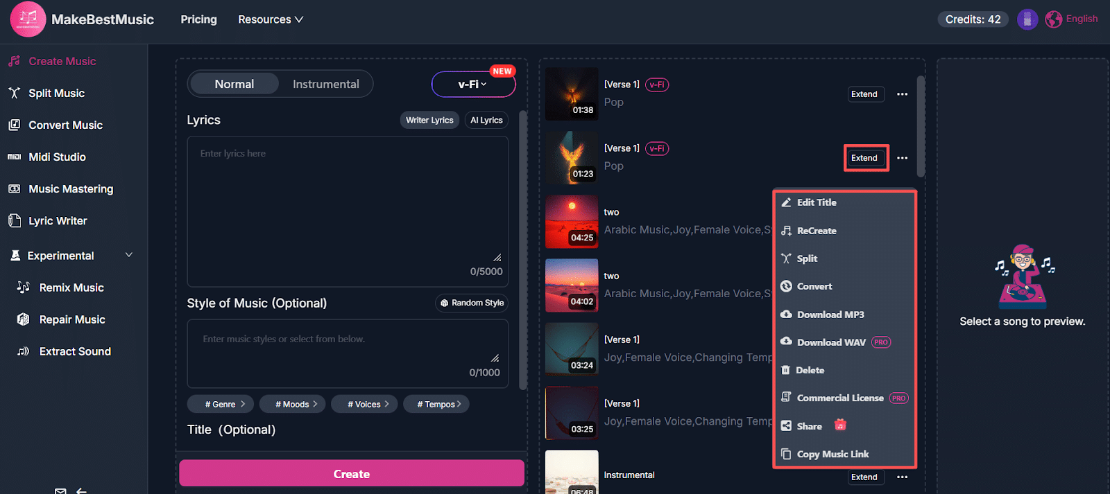 Sometimes the first version of your AI-generated song might not sound exactly how you imagined — and that’s perfectly okay. With MakeBestMusic, you can easily refine and reshape your track using tools like Extend, Recreate, Split, and Convert.