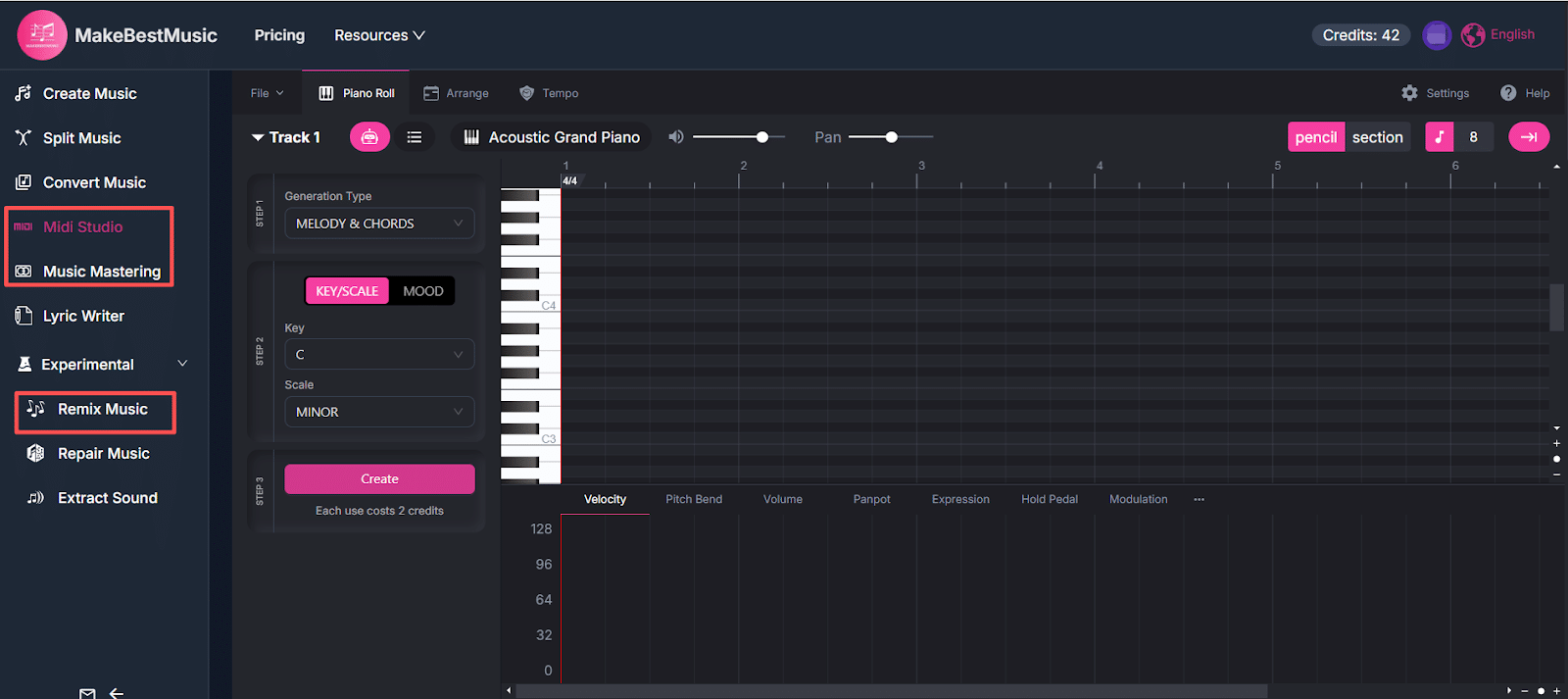 - MIDI Studio – MakeBestMusic lets you upload files for MIDI production, giving you more flexibility and precision in your creative process. You can work with separate tracks for each instrument, fine-tune details like rhythm, velocity, and tone, and build the perfect mix layer by layer. If you’re looking for deeper control and personal expression, this is the ideal feature to explore your own unique musical voice.