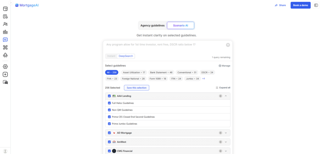 The Game Changer: Scenario AI The standout feature is Scenario AI, an AI-Powered Mortgage Guideline Assistant. It’s like having a dedicated underwriter sitting next to you 24/7.