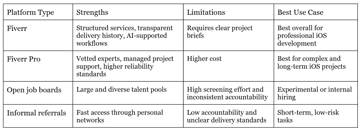 To make my decision process clearer, I compared the main platform types I actually used while hiring iOS developers online. What mattered most in practice was not how many developers were available, but how each environment handled accountability, communication, and long-term reliability once real development work began.